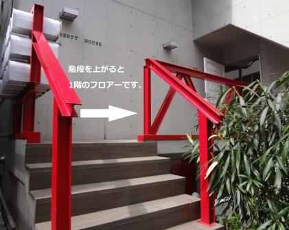 右手前に手前に、赤いてすりが目印の白い建物「リバティハウス」がございます。建物入口の階段を上がり、右手にお進みください。