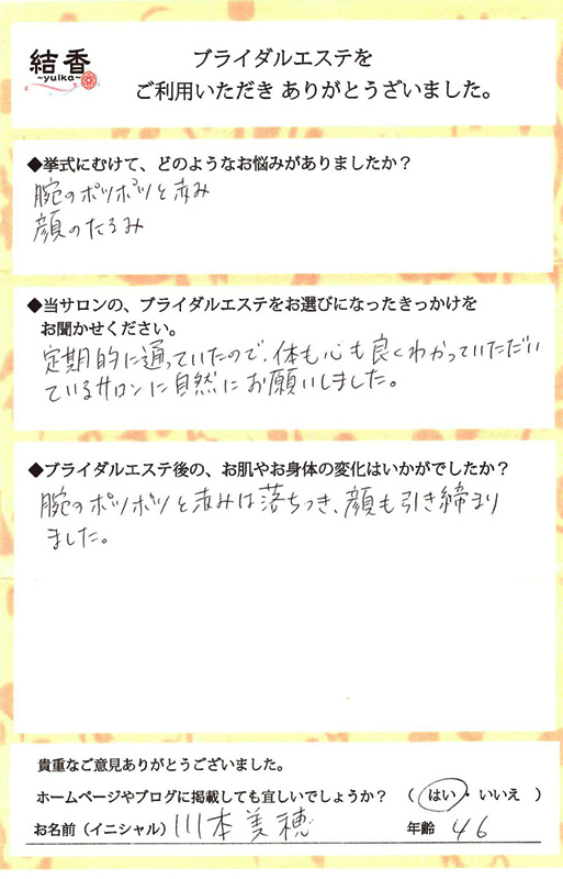 挙式まえのブライダル3回集中ケアをお願いしました。最後の日は、肌に弾力を感じ、頬がふっくらとしていました。 肌にいい食事のことも教えてもらえて、これからも続けていきます。